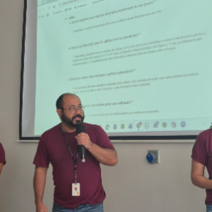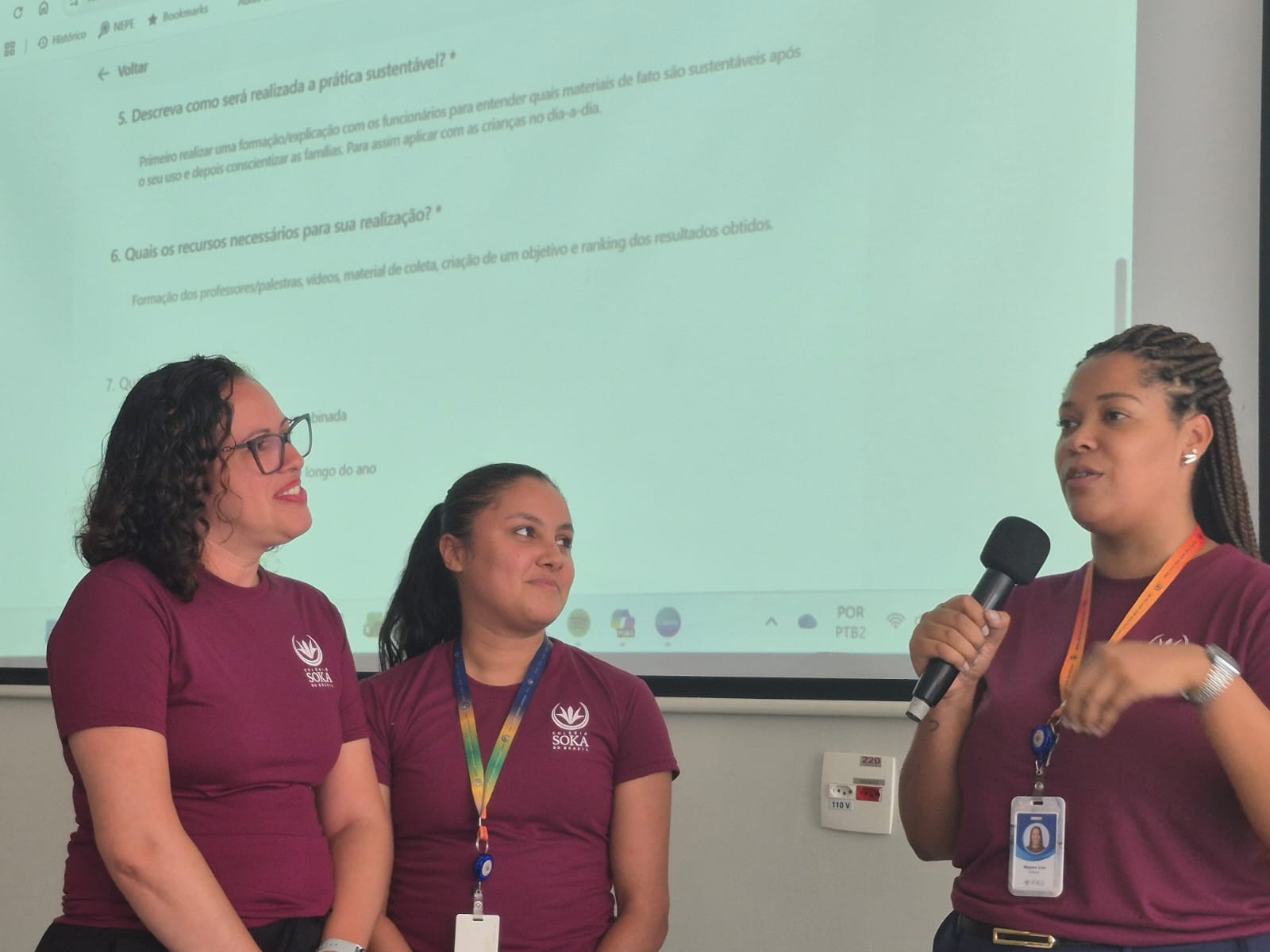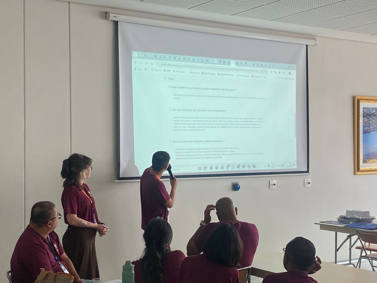 Em um outro momento, os profissionais foram divididos em três grupos com a missão de construir uma atividade de prática sustentável que possa envolver a família ou a comunidade integrando as turmas de alunos do seu grupo.