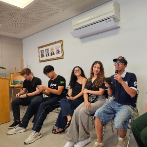 Durante conversa, os alunos Bruno Shiraishi, Larissa Ramos, Letícia Moritani, Leo Sawada e Lucas Daidone, compartilham experiências