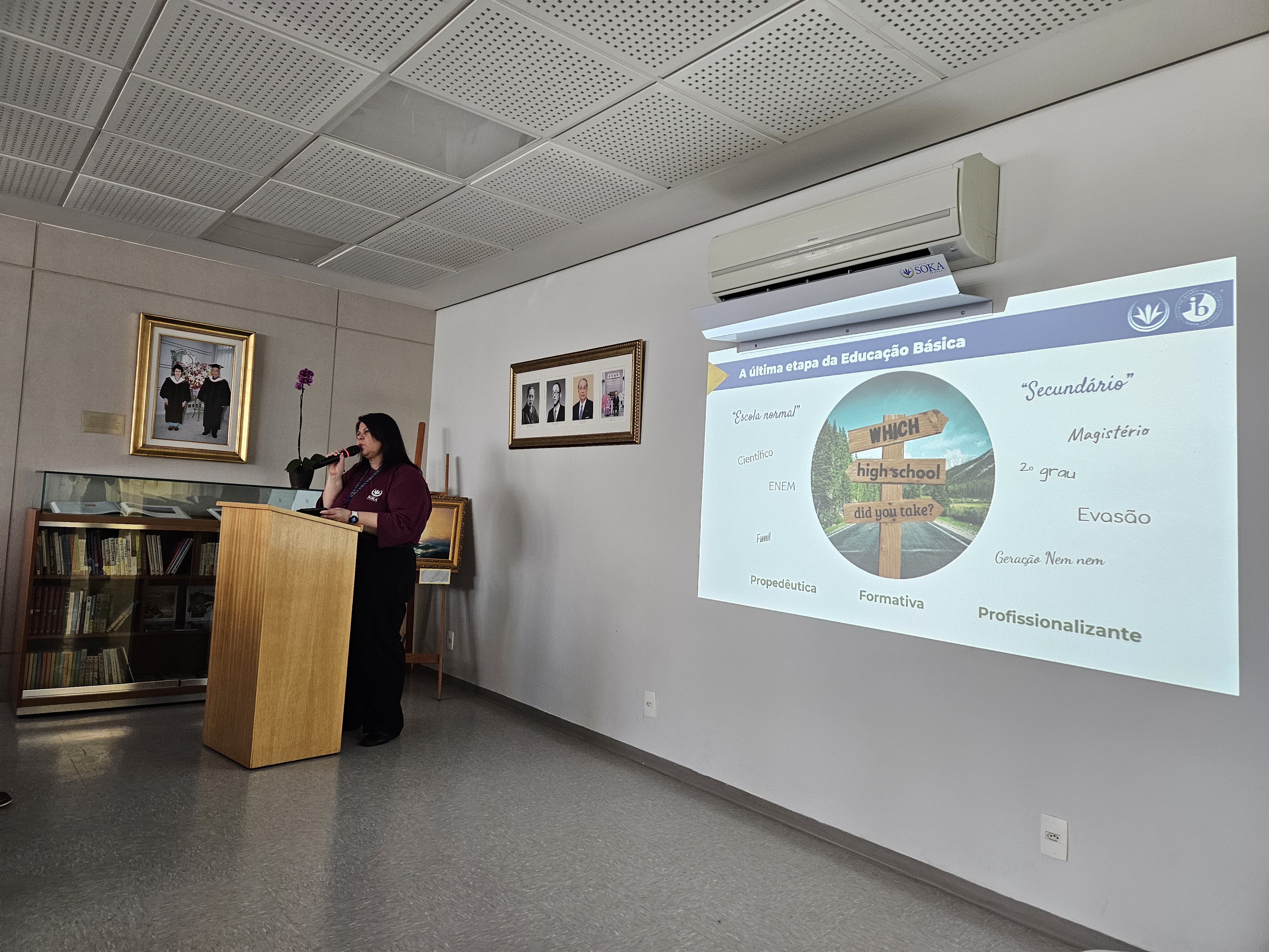 Juraci Alcântara, coordenadora pedagógica do Ensino Fundamental Anos Finais (EFAF) e do Ensino Médio (EM), iniciou sua fala convidando as famílias a refletir sobre a última etapa da educação básica e sobre como cada uma delas viveu esse período escolar, marcado pelas funções propedêutica, profissionalizante e formativa. Juraci também expôs, em detalhes, como o trabalho é desenvolvido e os diferenciais oferecidos aos estudantes, além da forma como o currículo IB abre portas em universidades do Brasil e do mundo.