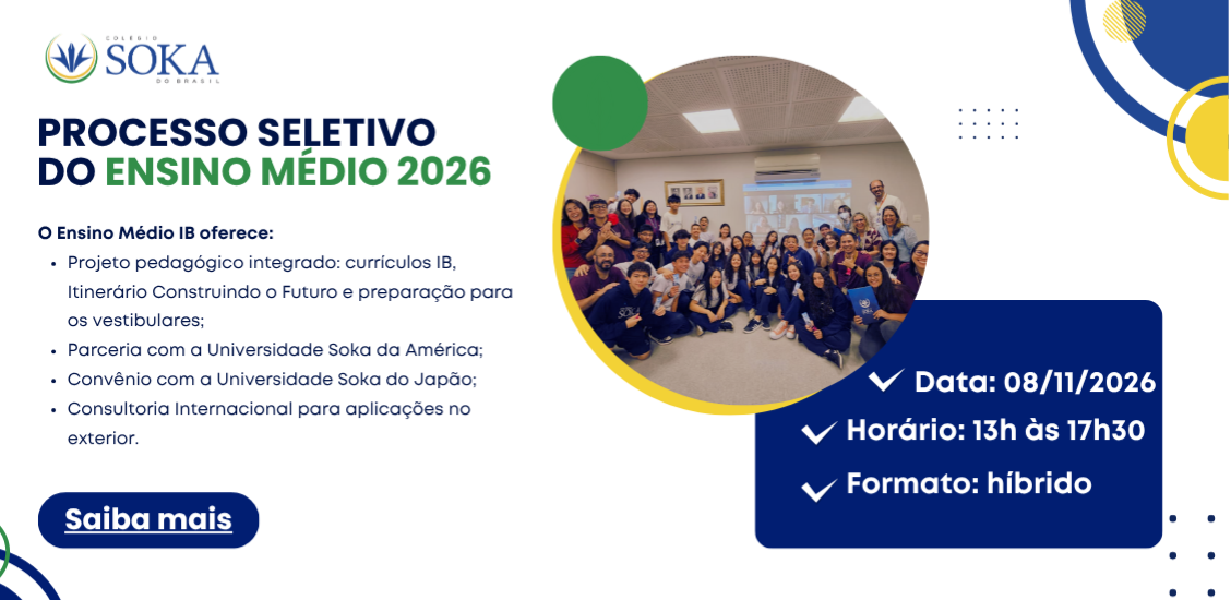Como IB World School, o Colégio Soka proporciona aos estudantes a opção de realizar o ensino médio com o certificado IB, possibilitando a obtenção dos dois diplomas na conclusão do segmento e mais chances de concorrer a bolsas de estudos em universidades. Ademais, o Programa de Diploma do IB é considerado um curso pré-universitário, por isso, essa experiência acadêmica, vivida no Ensino Médio Soka, possibilita aos estudantes maior preparo e segurança para cursar o ensino superior, seja no Brasil, seja no exterior.